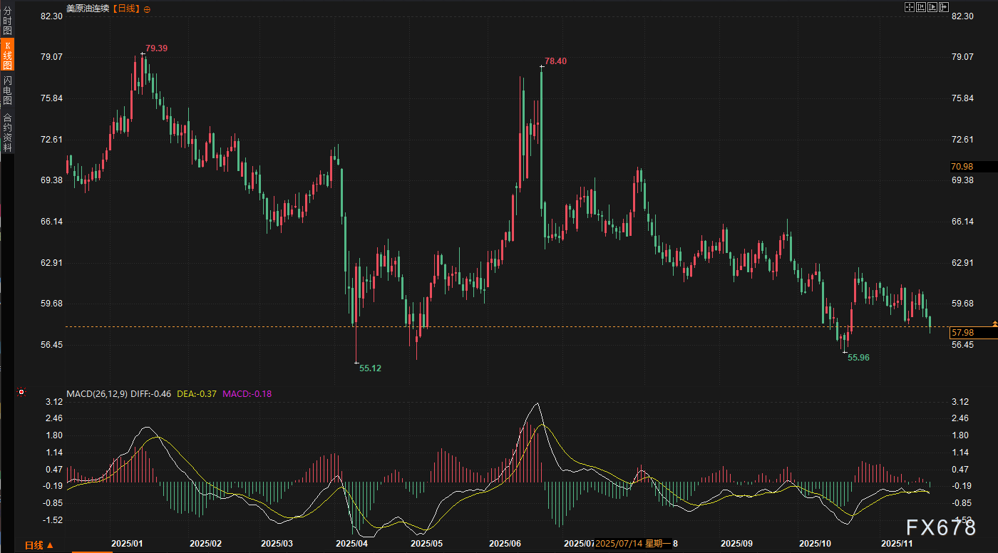 WTI原油(美原油): 截至周五(11月22日)收盘,WTI原油连续合约报收于58.76美元/桶,日内跌幅达到1.73%。从周线级别来看,本周美油累计下跌3.29%。细分到每日走势,空头明显占据了主导地位。除周二市场因技术性修正录得短暂上涨外,其余四个交易日均以阴线报收。周五的下跌尤为关键,一举击穿了此前维持数周的震荡区间下沿,确立了短期的下行趋势。