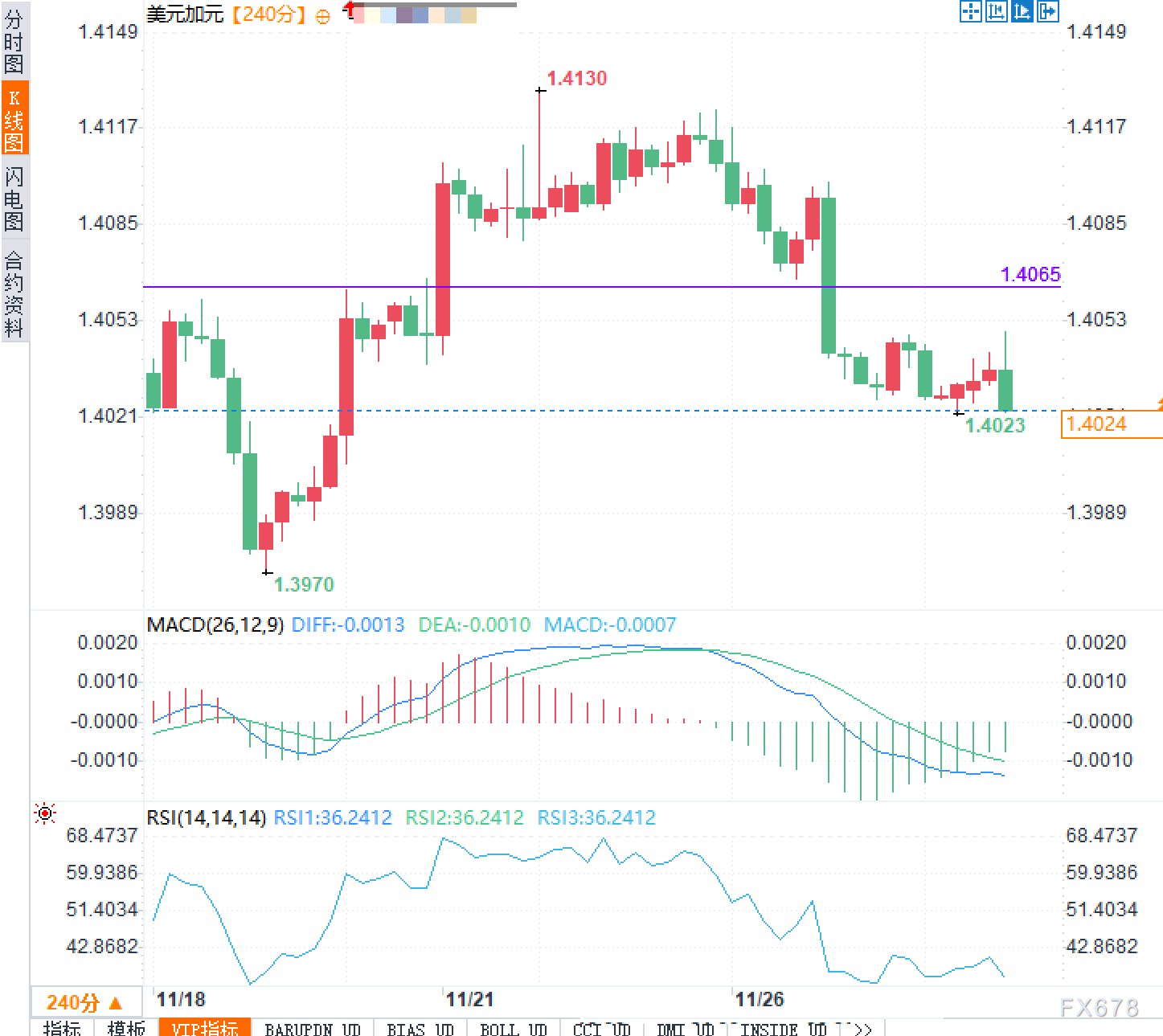 根据美元兑加元四小时K线图,当前价格为1.4024,整体走势呈现震荡整理的局面。